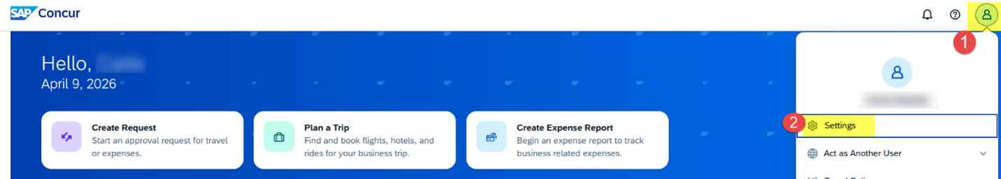 1. Log in to Concur and update the credit card information on your profile. You can access your profile by choosing the Open Profile icon and selecting Settings.