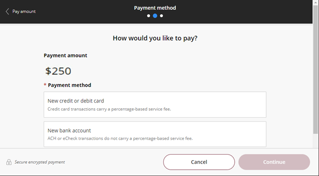 If adding a new credit card or ACH option you will be asked to enter your information on the next screen.