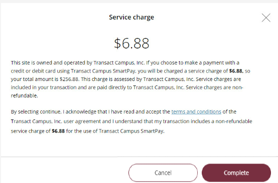 Transact accepts most major credit cards, ACH / Electronic Check, and International Wires through Western Union Business Solutions. Payments made by credit card will incur a 2.75% service fee for cards drawn on domestic bank accounts, and 4.25% service fee for international cards. ACH / Electronic Check transactions will not carry a service fee. Payments made by International Wire do not carry a service fee, but the student's bank may charge wire fees or other administrative costs.